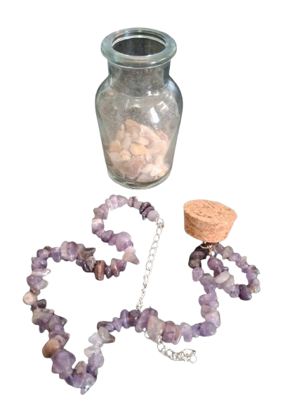 Possui extensor ajustável e a garrafa purificadora contém uma mistura de pedrinhas de dolomita e sal grosso, unindo estabilidade energética e purificação. basta colocá-lo nela para renovar sua força espiritual.